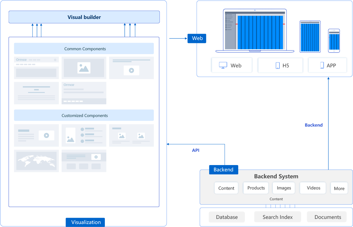 我们整体架构是基于全功能CMS,后端包括内容、媒体、分类、检索、SEO等所有CMS必备功能,前端通过可视化构建,可以将所有数据进行组件化,然后在页面展示。